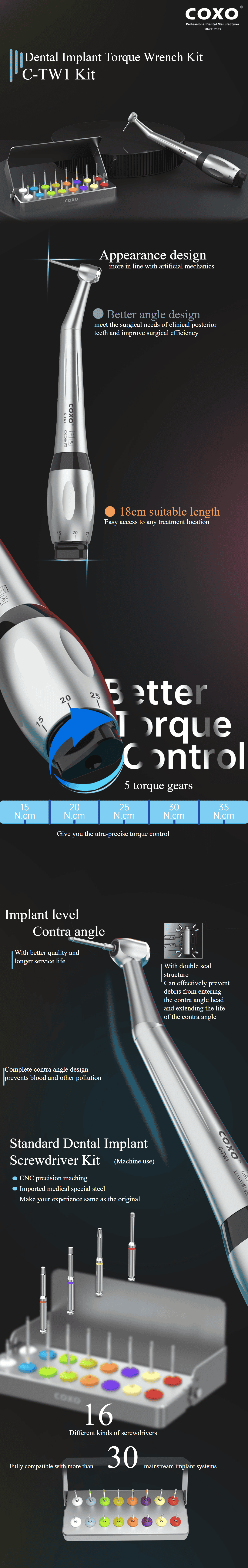 Cheia dinamometrică automată C-TW1 de la COXO, împreună cu setul de adaptoare, este un instrument esențial pentru procedurile de implantologie dentară. Acest dispozitiv avansat asigură aplicarea precisă și controlată a cuplului de strângere necesar pentru fixarea implanturilor, contribuind la succesul și durabilitatea tratamentelor.