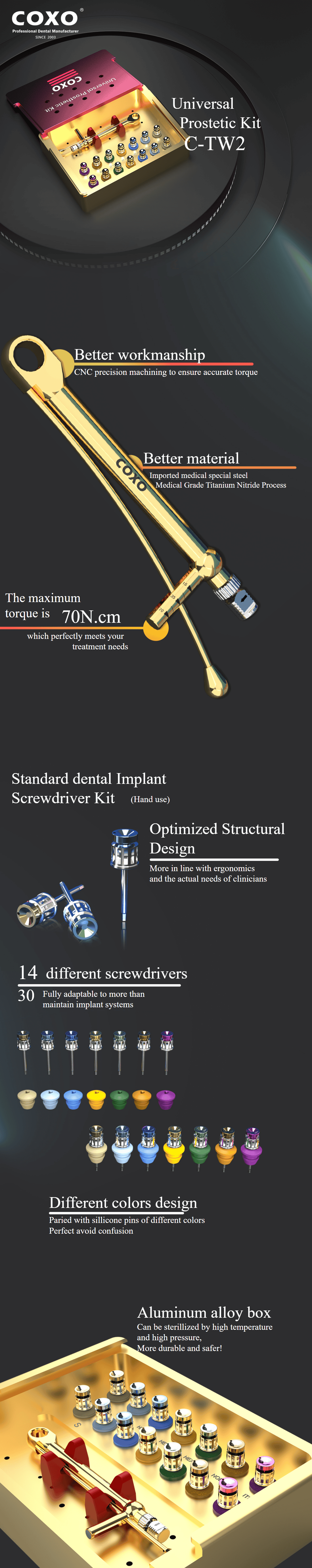 Cheia dinamometrică C-TW1 COXO, împreună cu setul de adaptoare, este un instrument indispensabil pentru orice cabinet stomatologic specializat în implantologie, oferind performanță superioară, precizie și confort în utilizare, contribuind astfel la succesul tratamentelor cu implanturi dentare.