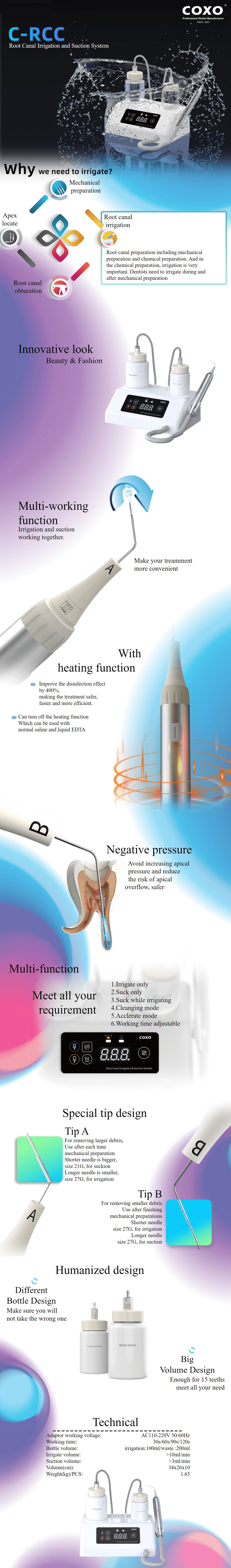 The C-RCC endodontic irrigation device from COXO is a state-of-the-art device designed to enhance efficiency and precision in endodontic irrigation procedures. Utilizing advanced technology, this device facilitates the cleaning and disinfection of root canals, ensuring the success of endodontic treatments and maximum patient comfort.