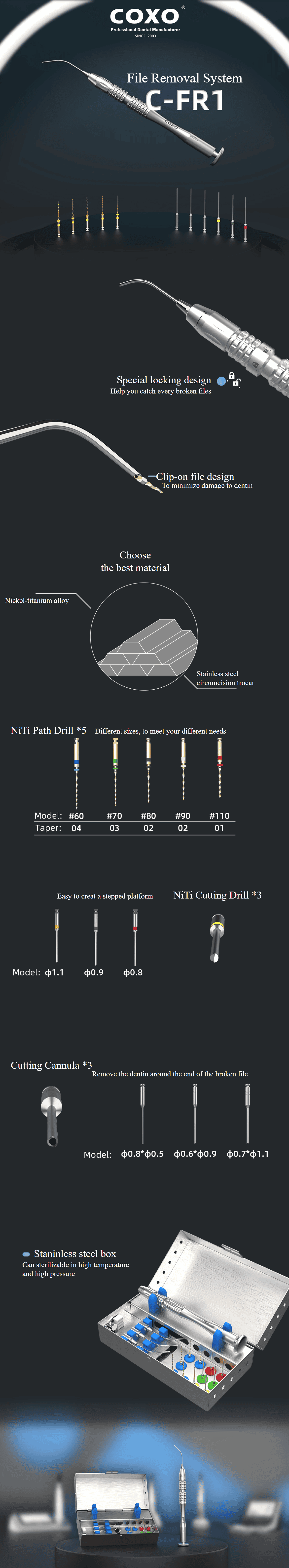 Das System zum Entfernen gebrochener Nadeln C-FR1 von COXO ist ein unverzichtbares Instrument für jede auf Endodontie spezialisierte Zahnarztpraxis und bietet überlegene Leistung, Sicherheit und Komfort bei der Anwendung, wodurch es zum Erfolg komplexer endodontischer Behandlungen beiträgt.