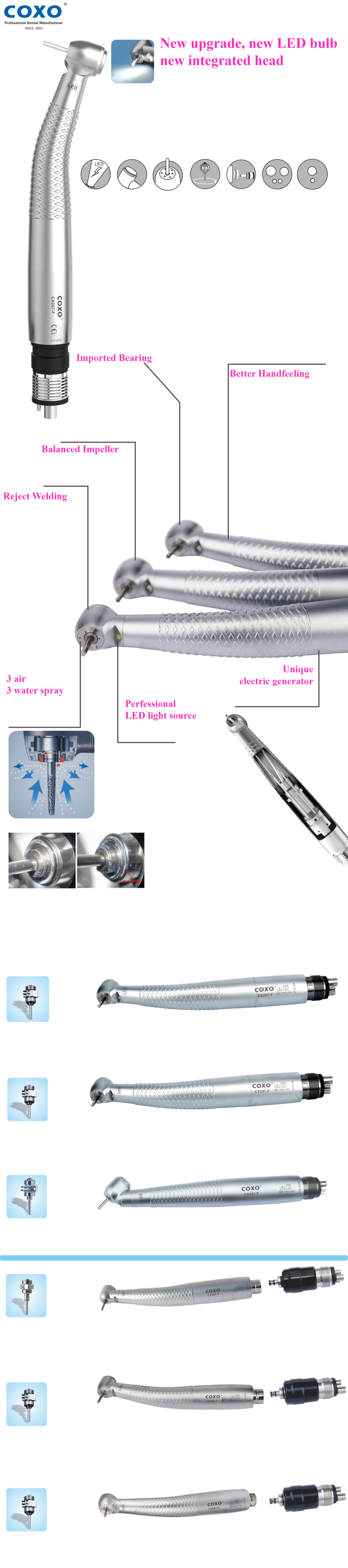 Coxo Medical LTD produce oltre 50 modelli di turbine dentali, contrangoli e molte altre attrezzature mediche che contengono pezzi importati da Giappone, Corea, Germania. Ogni prodotto COXO è realizzato con cura. Coxo pone l’accento sia sul design che sulla selezione dei materiali e sulla produzione ottimale delle attrezzature odontoiatriche.