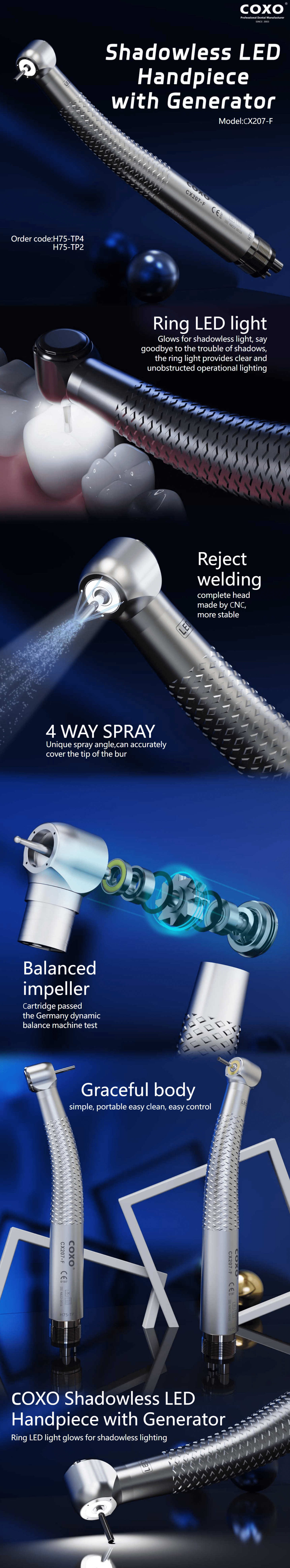 Die H75-TP Dental Turbine von COXO, ausgestattet mit einem internen Generator und Shadowless LED, ist ein Hochleistungsinstrument für zahnärztliche Behandlungen. Sie bietet schattenfreie Ausleuchtung und erhöhte Effizienz und ist ideal für verschiedene zahnärztliche Eingriffe.