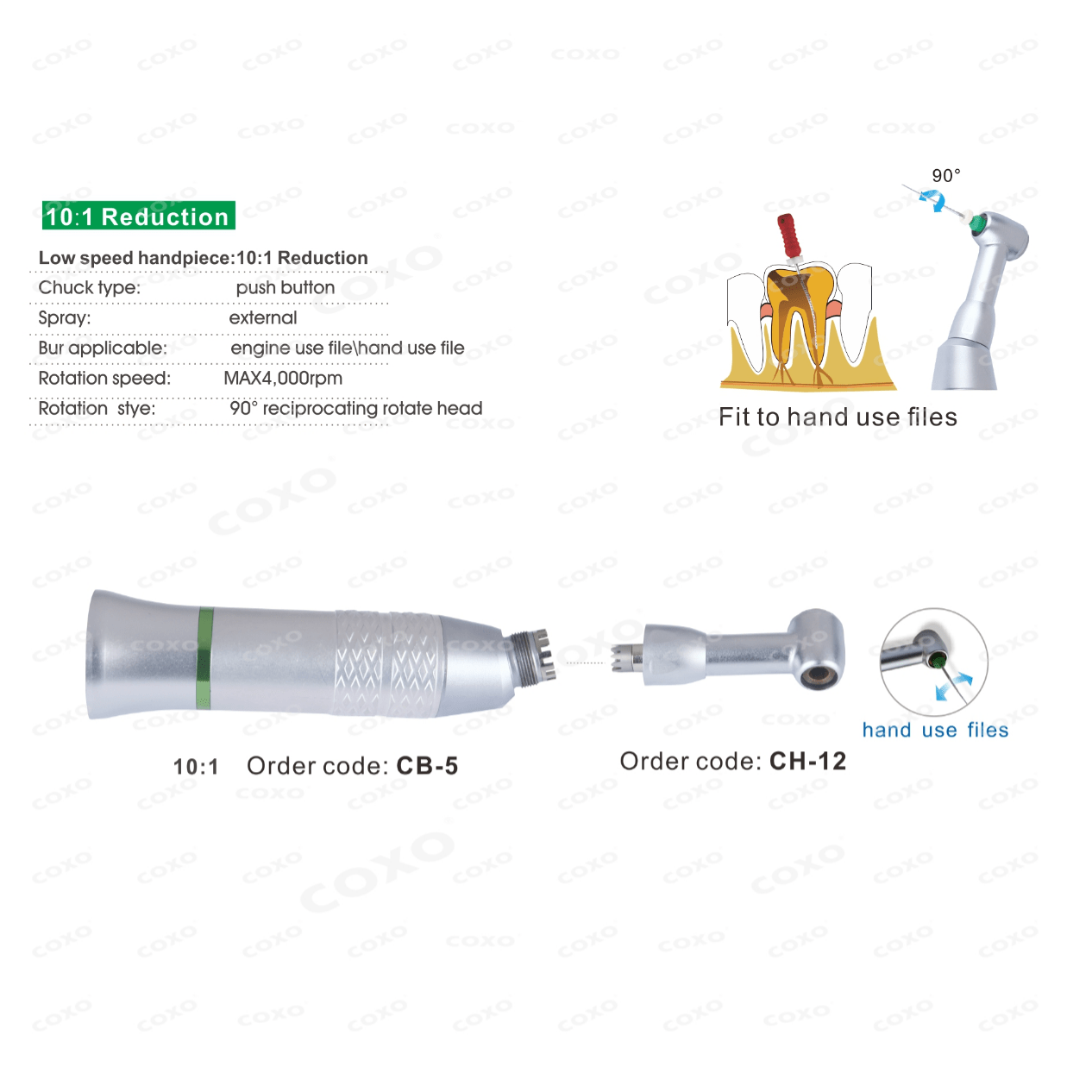 Das Endo-Winkelstück C5-12 von COXO mit 10:1 Untersetzung ist ein unverzichtbares Instrument für endodontische Eingriffe. Speziell für die Verwendung mit Handfeilen entwickelt, bietet dieses Winkelstück optimale Präzision und Kontrolle und erleichtert effiziente und sichere endodontische Behandlungen.