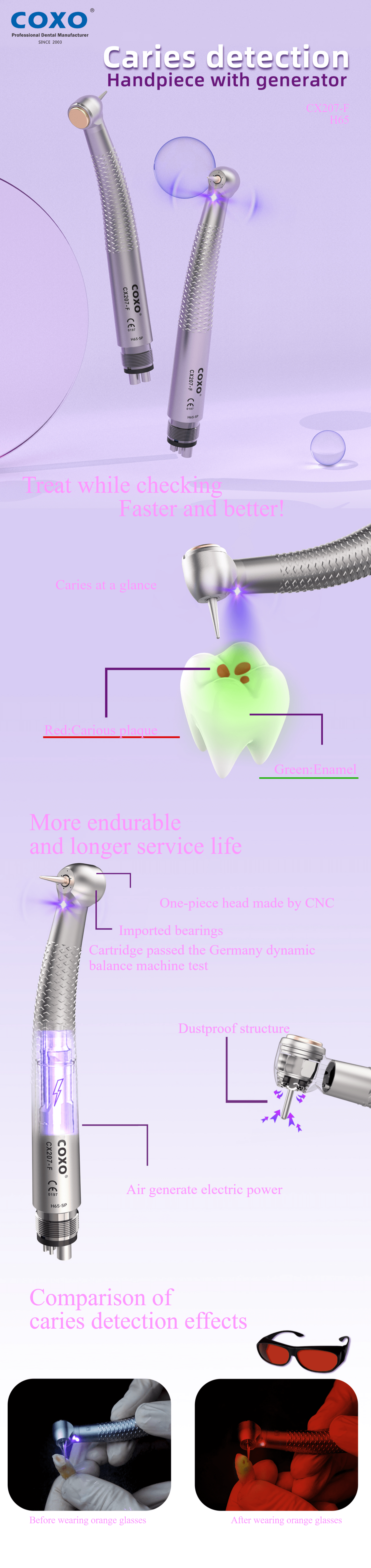 The main products from Coxo are: dental turbine with LED, contra-angle and straight handpiece, electric and pneumatic micromotor, apex locator, caries detector, etc.